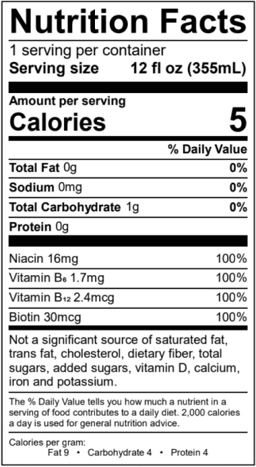 Natural Mango Flavor and other Natural Flavors, Potassium Citrate, Natural Caffeine from Green Tea, Steviol Glycosides (Reb M), L-Theanine, Beta Carotene for Color, Niacinamide (Vitamin B3), Ginger Root Extract, Pyridoxine Hydrochloride (Vitamin B6), Biotin,Cyanocobalamin (Vitamin B12).