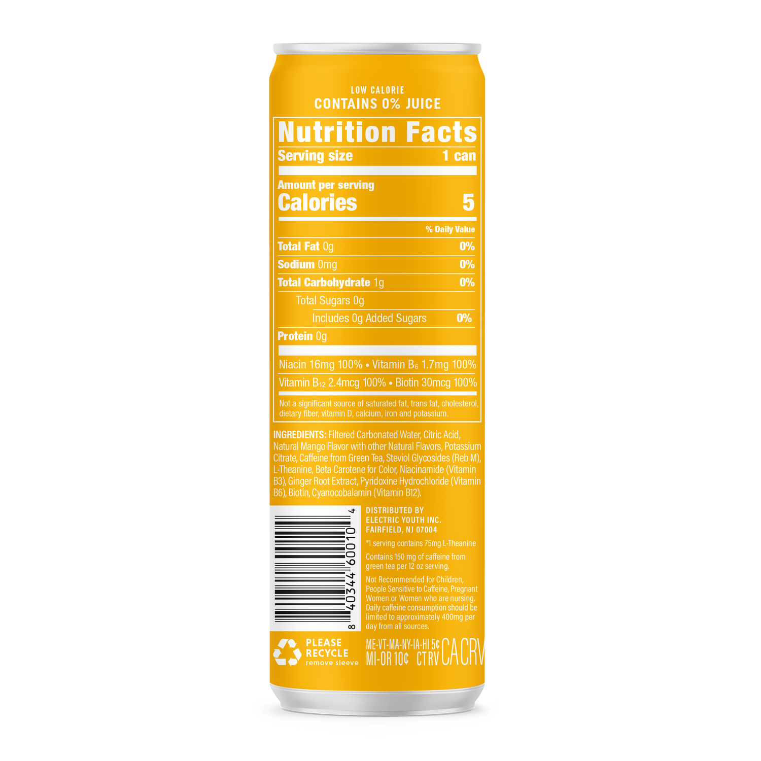 Natural Mango Flavor and other Natural Flavors, Potassium Citrate, Natural Caffeine from Green Tea, Steviol Glycosides (Reb M), L-Theanine, Beta Carotene for Color, Niacinamide (Vitamin B3), Ginger Root Extract, Pyridoxine Hydrochloride (Vitamin B6), Biotin,Cyanocobalamin (Vitamin B12).
