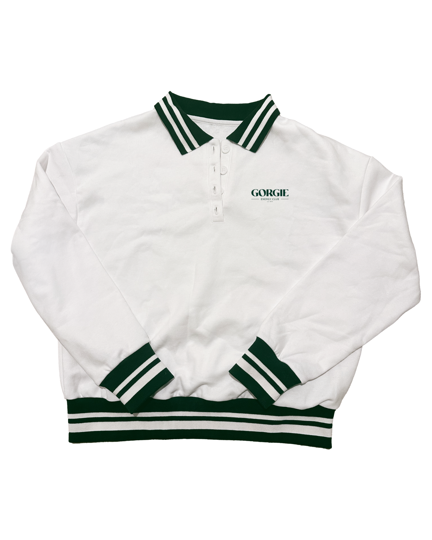 -Green striped collar, cuffs and bottom band